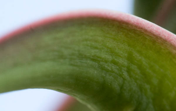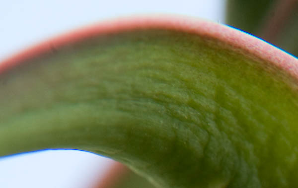 Exempel på kromatisk aberration. Klicka på bilden för att se färgförskjutningen tydligare (just i denna bild är det blåa linjer längs bladkanten).