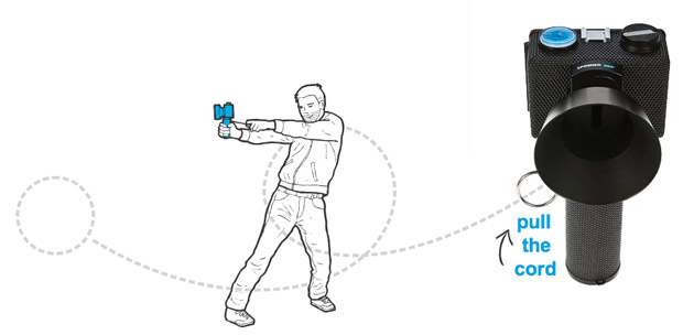 Håll kameran med en hand och dra i snöret med det andra. Kameran roterar samtidigt som filmen dras fram synkroniserat och panoramabilden är ett faktum.
